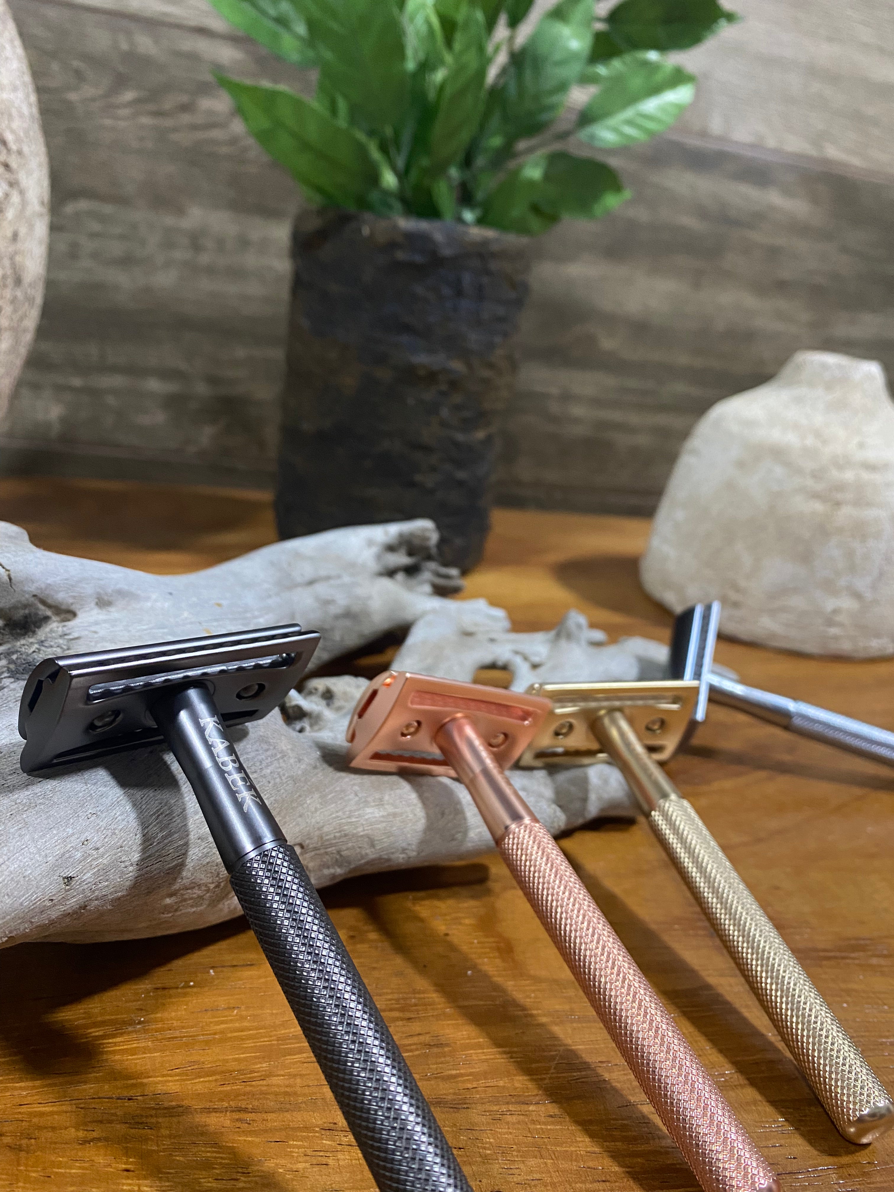 Escoge tu rasuradora reutilizable 100% de acero inoxidable en alguno de los 4 colores: Negro, Plateado, Dorado y Oro rosa.